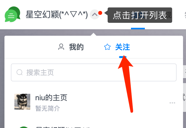 当关注好友主页后,你点击你的主页左上角主页名称后面的箭头,打开主页列表。切换到关注标签,即可查看已关注的主页。