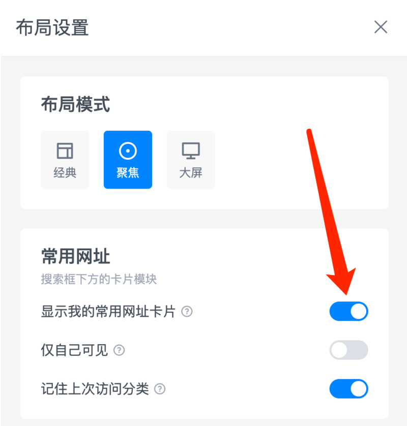 点击顶部导航栏【布局】按钮,打开布局设置面板。如果需要显示我的常用网址模块则开启开关,否则关闭开关即可生效。