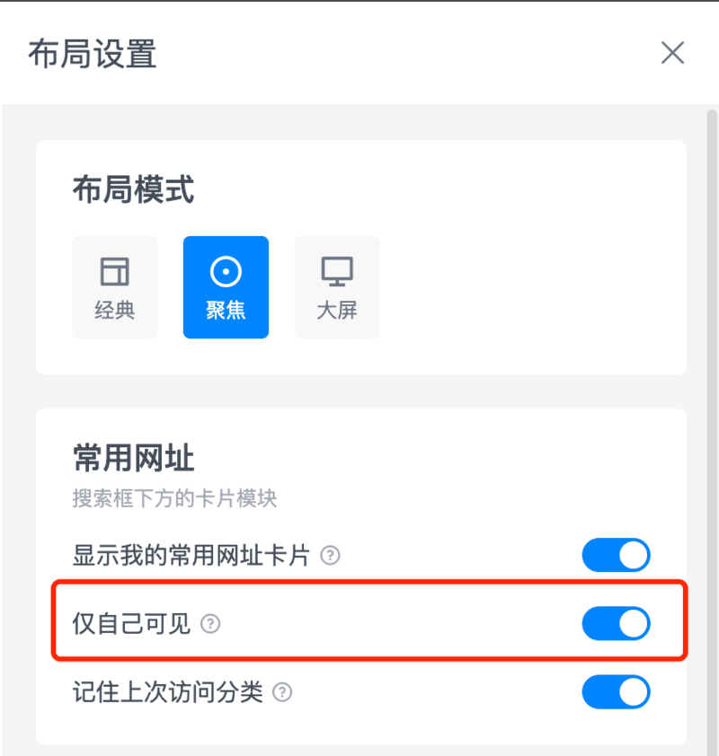 有一种场景,你的常用网址模块放着你的私密书签。日常使用你希望我的常用网址模块展示,但是主页分享给其他用户时候,我的常用网址模块不展示,保护隐私。