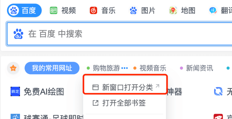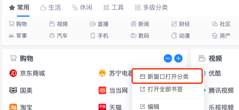 新窗口浏览分类下的书签更加直观方便。每个分类都可以在新窗口打开。1、我的常用网址;2、单级分类模块;3、多级分类模块新窗口打开分类步骤大致相同。下面一一介绍。