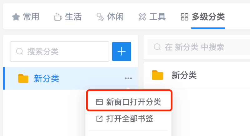 点击你需要在新窗口打开的分类卡片右上角三个点按钮(鼠标触摸分类卡片可显示),打开下拉菜单,点击下拉菜单【新窗口打开分类】选项,即可在新窗口打开分类内容。