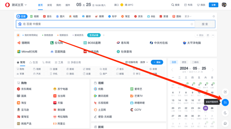 默认状态下书签无法进行拖动排序。排序之前,你需要点击页面右下角的排序按钮,开启排序。