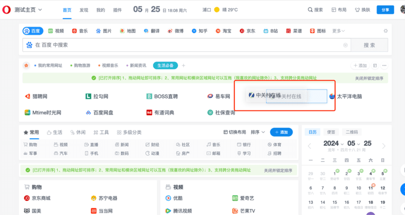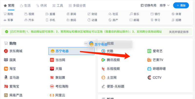 除了可以在同一个分类里面拖动网址排序。你还可以直接跨分类拖动书签并排序。比如下图把书签从左侧分类卡片拖动到右侧分类卡片。