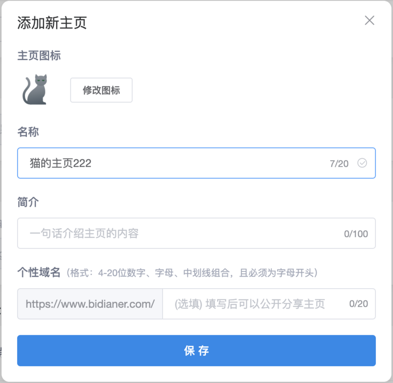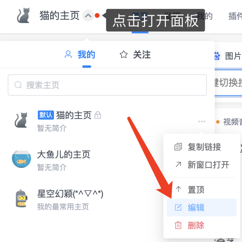 点击左上角主页名称右侧小箭头,打开主页列表面板。找到你需要修改的主页,点击列表右侧的三个点按钮,打开操作菜单,点击【编辑】选项即可打开编辑主页弹框。